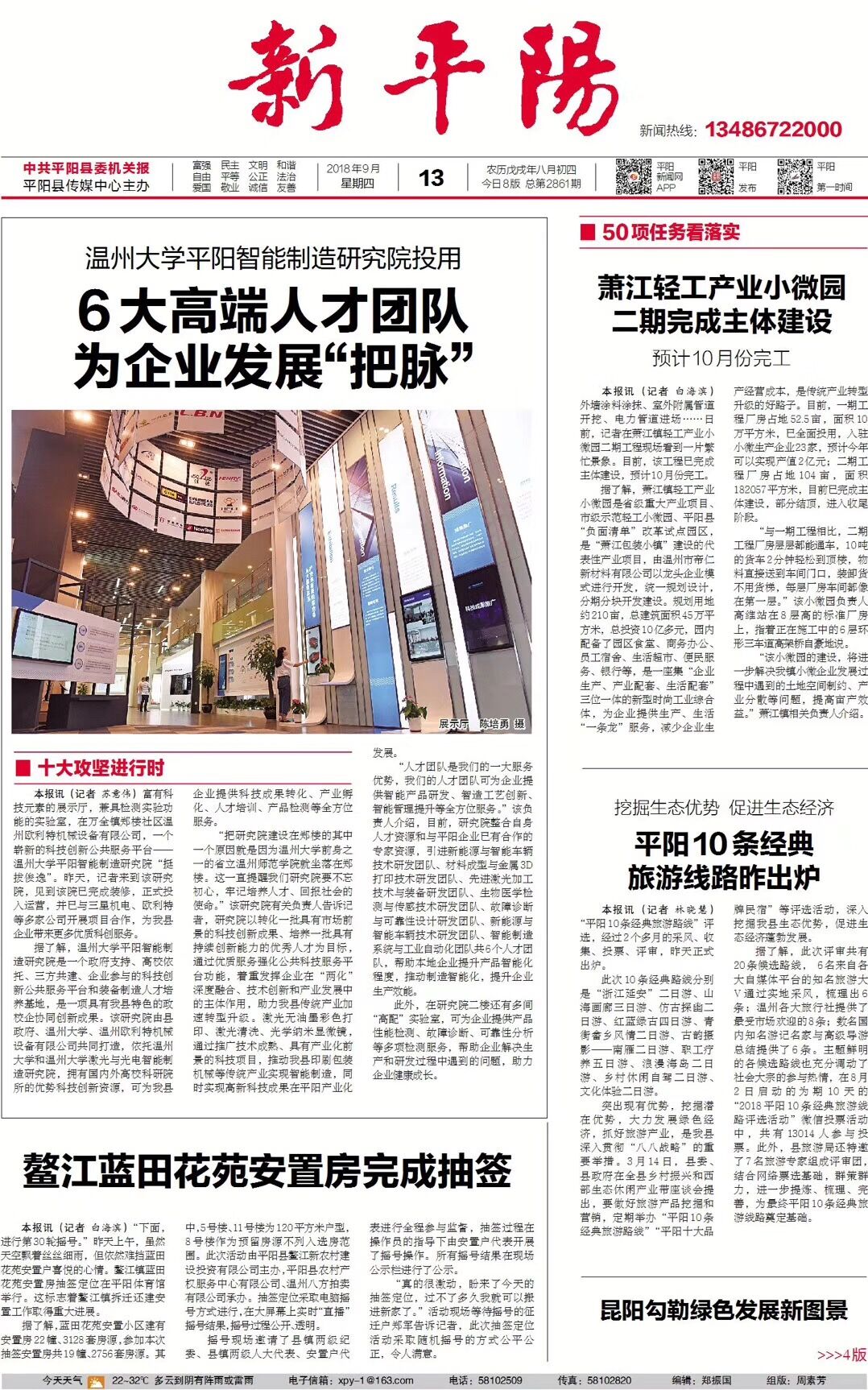 本报讯(记者苏意伟)富有科技元素的展示厅,兼具检测实验功能的实验室,在万全镇郑楼社区温州欧利特机械设备有限公司,一个崭新的科技创新公共服务平台——温州大学平阳智能制造研究院“挺拔俊逸”。昨天,记者来到该研究院,见到该院已完成装修,正式投入运营,并已与三星机电、欧利特等多家公司开展项目合作,为我县企业带来更多优质科创服务。