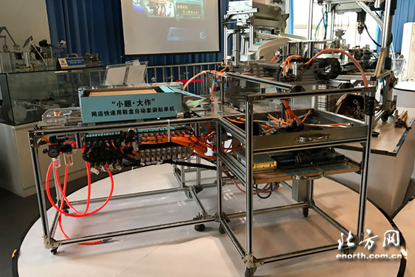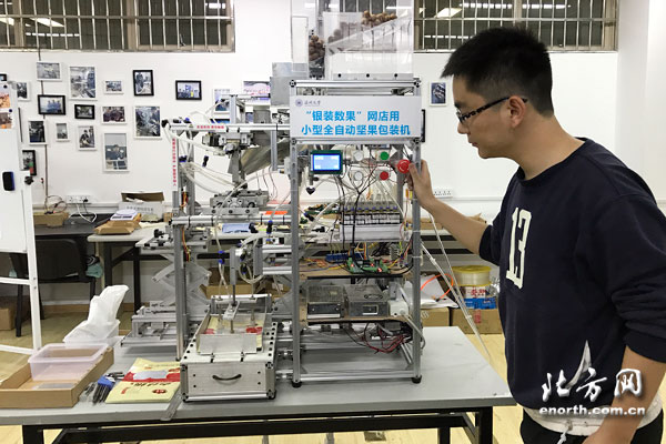 走进机电学院,学生们研发的各类作品马上吸引了记者的眼球,迫不及待地想要学生展示他们的作品。在学生演示时该学院负责人介绍到:“像这台小型全自动坚果包装机的设计灵感就是来源于生活,对于坚果网店很有实用价值,省去了很多人力支出。我们的学生都是在玩中学,在生活中发现、创造。”此外,还有学生制作了网店快递用鞋盒自动套袋贴单机等,方便实用,很符合现在网商的需求。
