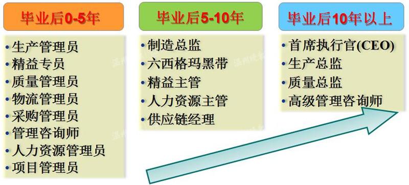 毕业0~5年内担任生产管理员、精益专员,毕业5~10年内出任制造总监、供应链经理,毕业10年以上升任首席执行官、高级管理咨询师……温州大学工业工程专业还对人才的职业发展路径作出了详细的规划。清晰明确的发展路径为学生指明了未来发展方向,也为学生们制定了人生不同阶段的“小目标”,助推学生们走入社会后逐步实现人生价值。