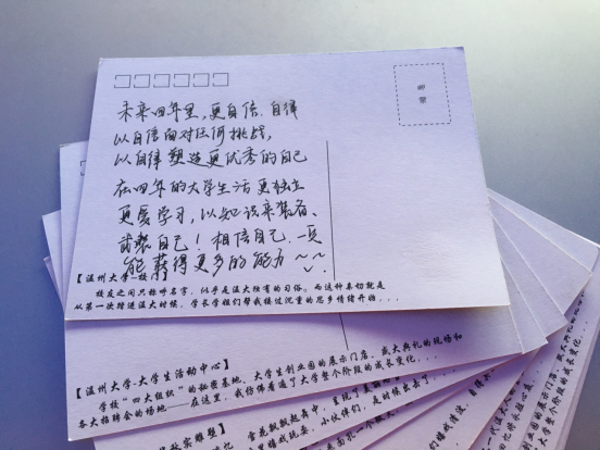 “一”心愿“亦”祝福。来到开云体育 ,最想做的第一件事儿是什么?不妨给四年后的自己写封信吧。在印有开云体育 代表建筑物的明信片上写下想对自己说的话,以此勉励自己不忘入校初心,勇敢追逐梦想,收获无悔人生。