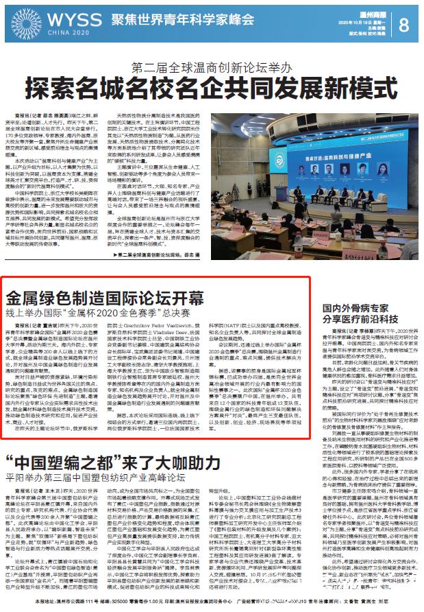 商报讯(记者 董吉妮)昨天下午,2020世界青年科学家峰会国际“金属杯2020金色赛季”总决赛暨金属绿色制造国际论坛在温州大学开幕,活动为期三天。海内外院士、专家学者、企业精英等 200 余人以线上线下的方式,就全球金属制造业绿色发展趋势展开讨论,并对温州及中国金属绿色制造行业发展遇到的问题建言献策。