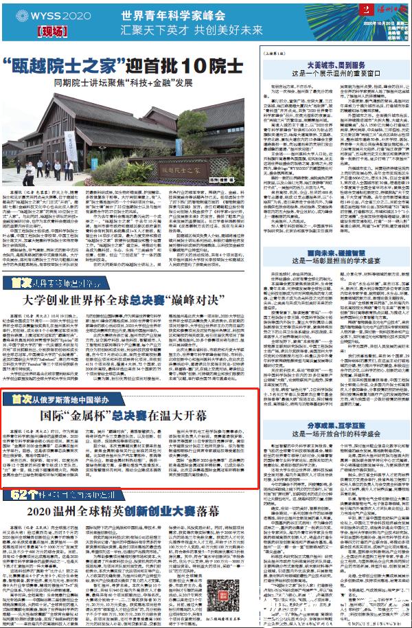 本报讯(记者 周大正)昨日,作为首届世界青年科学家(温州)峰会的重要成果、2020世界青年科学家峰会核心活动项目,第五届国际“金属杯2020金色赛季”总决赛在温州大学举行。据悉,这是该项赛事总决赛首次走出俄罗斯,落地中国举行。