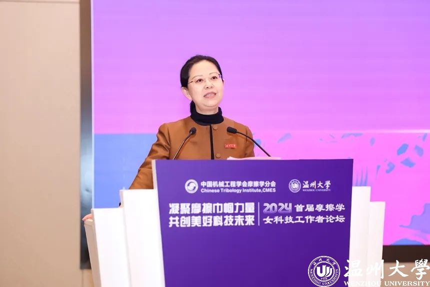刘玉侠副校长在论坛开幕式上致欢迎词,对莅临首届摩擦学女科技工作者论坛的各位领导、专家学者表示热烈的欢迎。她表示,希望通过此次会议的召开,能够进一步激发科技创新中的女性力量,大力助推摩擦学及相关领域的创新发展。并诚挚邀请各位专家学者多到温州大学指导工作,加强人才、项目、平台等方面的交流合作,携手在实现高水平科技自立自强、推动建设教育强国中作出新的更大贡献!