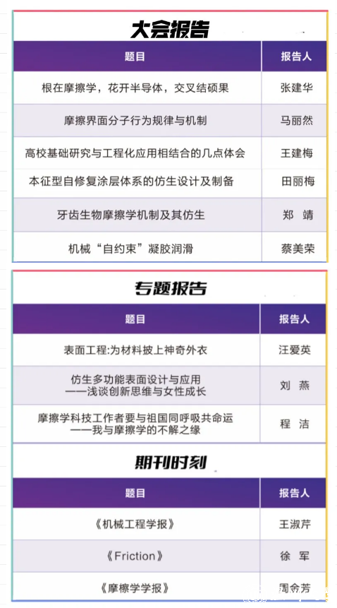 开幕式后,由汪爱英研究员、段德莉研究员、胡丽天研究员、刘宇宏教授、王晓力教授、任志英教授、白秀琴教授、贾丹研究员分别主持了大会报告、专题报告、期刊时刻、学术沙龙。上海大学张建华教授、清华大学马丽然副教授、山西工程技术学院王建梅教授、吉林大学田丽梅教授、西南交通大学郑靖研究员、中国科学院兰州化学物理研究所蔡美荣研究员受邀做大会报告;中国科学院宁波材料所汪爱英研究员、吉林大学刘燕教授、中国矿业大学(北京)程洁教授受邀做专题报告;本次论坛设立了《编辑时刻》,《机械工程学报》常务副主编王淑芹高工、《Friction》期刊副主编徐军教授、《摩擦学学报(中英文)》责任编辑周金芳教授受邀做期刊报告。论坛设立了《学术沙龙》,摩擦学女科技工作者与大家分享女科技工作者科研之路。并邀请温州大学蒋胜男教授做了文学讲座。