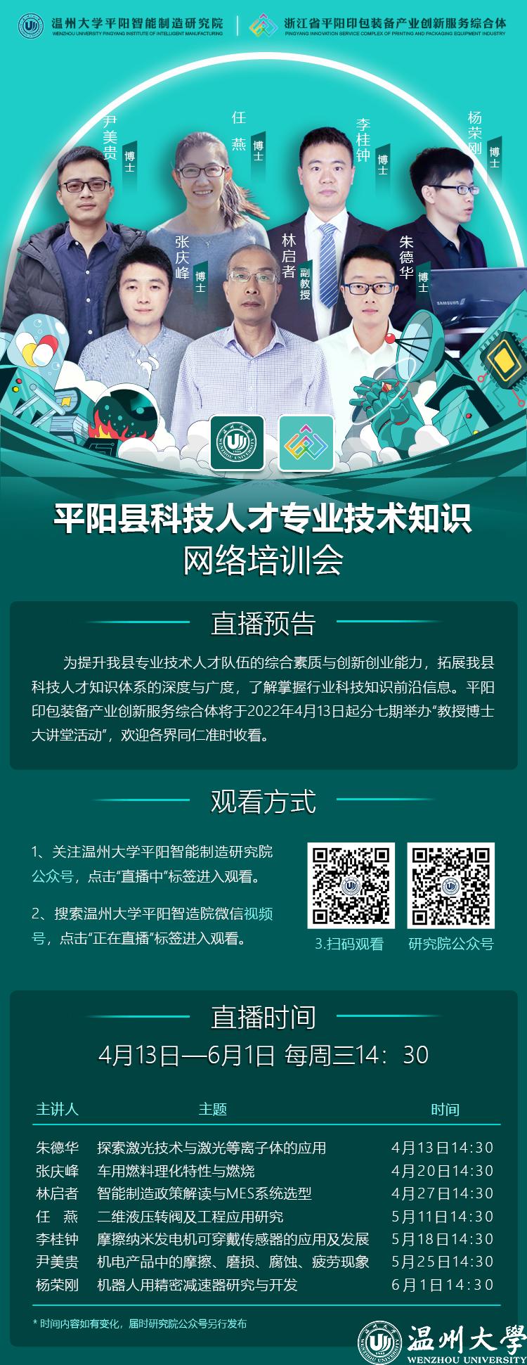 为提升我县专业技术人才队伍的综合素质与创新创业能力,拓展我县科技人才知识体系的深度与广度,了解掌握行业科技知识前沿信息。平阳印包装备产业创新服务综合体将于2022年4月13日起分七期举办”教授博士大讲堂活动”,欢迎各界同仁准时收看。