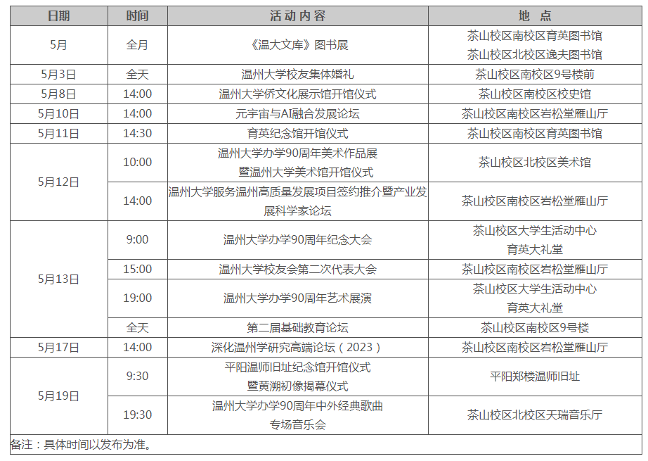 盛世相约,同庆华诞。2023年是温州大学“校庆年”,5月为“校庆月”。学校将举行校庆系列活动,5月13日上午9时举行办学90周年纪念大会,下午3时举行校友会第二次代表大会,晚上7时举行办学90周年艺术展演。同时,学校还将开展服务温州高质量发展项目签约推介暨产业发展科学家论坛、深化温州学研究高端论坛、基础教育论坛等系列学术性活动,举行美术馆、侨文化展示馆、育英纪念馆等开馆仪式,及校友集体婚礼。