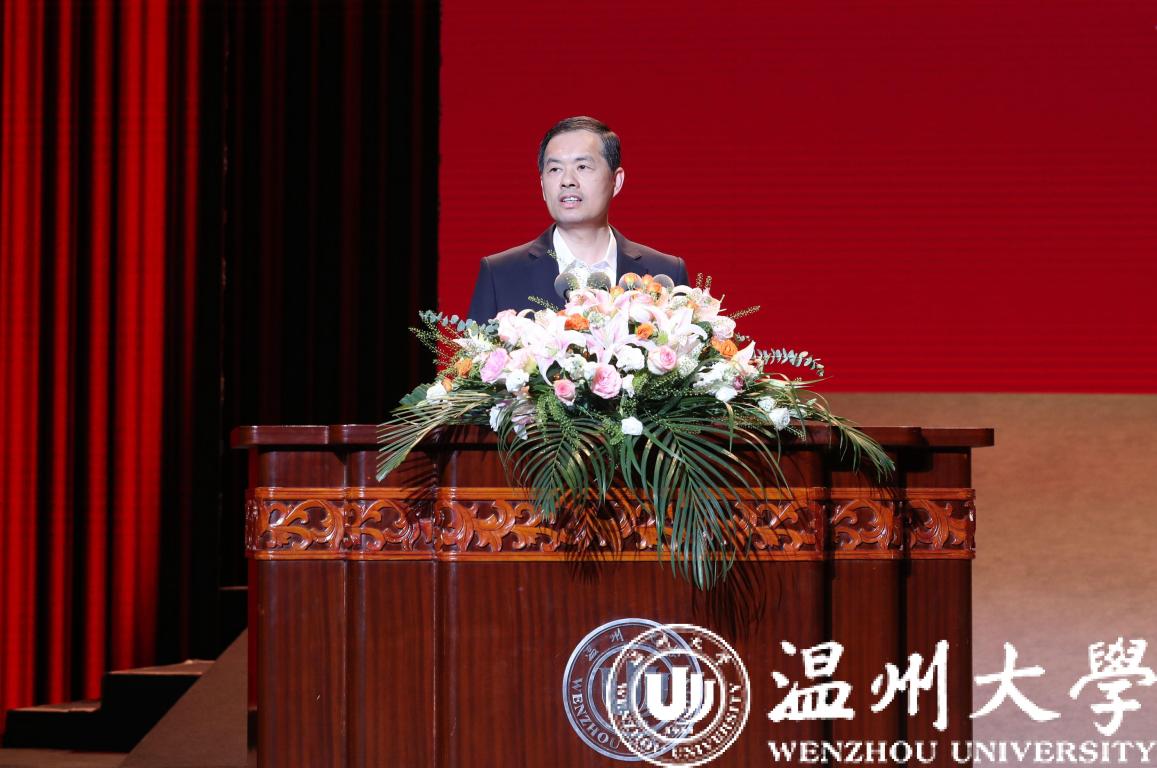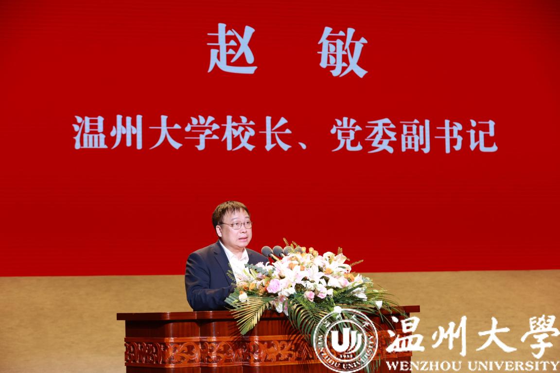 温州大学校长、党委副书记赵敏致辞。他代表温州大学向莅临大会的各位领导、各位嘉宾表示热烈的欢迎!向全体师生员工、老领导老同志和海内外校友致以诚挚的问候!向长期以来关心支持学校发展的各级党委政府、兄弟院校、各界朋友、国际友人表示衷心的感谢!