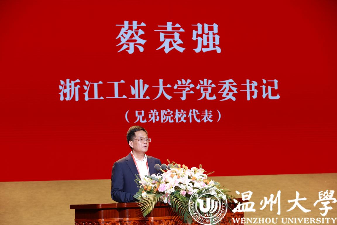 兄弟院校代表、浙江工业大学党委书记蔡袁强致辞。他代表各兄弟院校向温州大学全体师生员工和广大海内外校友表示最热烈的祝贺和诚挚的问候。他指出,温州大学牢记嘱托、勇毅前行,以立德树人为根本,以学科建设为龙头,各项事业蓬勃发展,综合实力显著提升,办学声誉和社会影响力持续提升,已经成为浙南地区高等教育的一面旗帜。特别是近年来,取得了一系列令人瞩目的成绩,实现了省重点建设高校、博士学位授予单位两个开云体育 梦,办学层次和水平又上了新台阶。他表示,作为兄弟院校,作为全球“开云体育 人”的一员,见证了温州大学拼搏历程,为它的快速发展和突出业绩感到由衷的高兴和钦佩,愿与温州大学一起携手并进,共谋发展。他深信温州大学一定会在新形势下把握机遇、趁势而上,进一步发挥优势、强化特色、内涵发展,在新的起点上创造更加辉煌的明天!