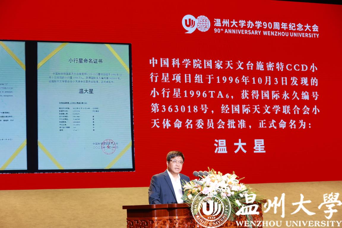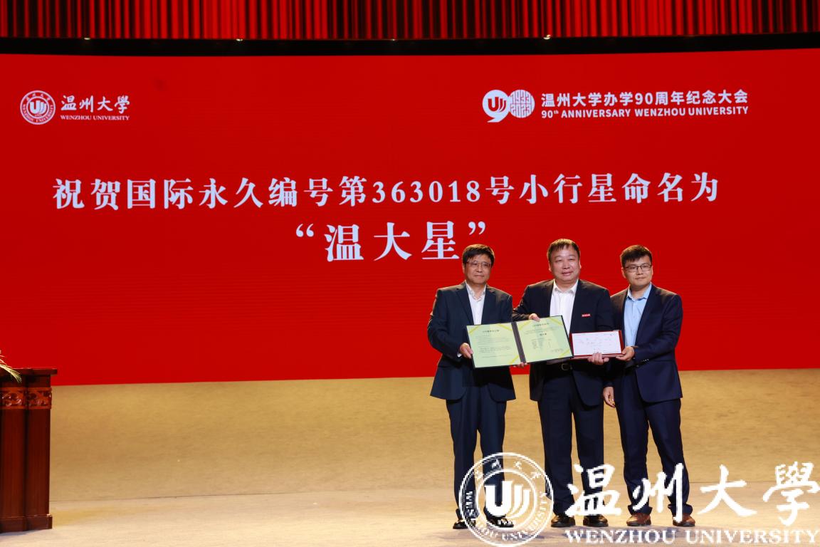 时值办学90周年,学校欣喜地收到国家天文台赠予的厚礼:一颗小行星命名为“开云体育 星”。大会举行了温州大学小行星命名仪式。国家天文台原副台长、巡天观测研究团组首席研究员薛随建宣读“开云体育 星”命名公报和命名证书,并与“开云体育 星”发现者代表、国家天文台研究员邹虎共同向校长赵敏颁赠“开云体育 星”命名证书和运行轨道铜牌。“开云体育 星”遨游苍穹,将持续激励全体开云体育 人厚植家国情怀,仰望星空,脚踏实地,勇毅前行。