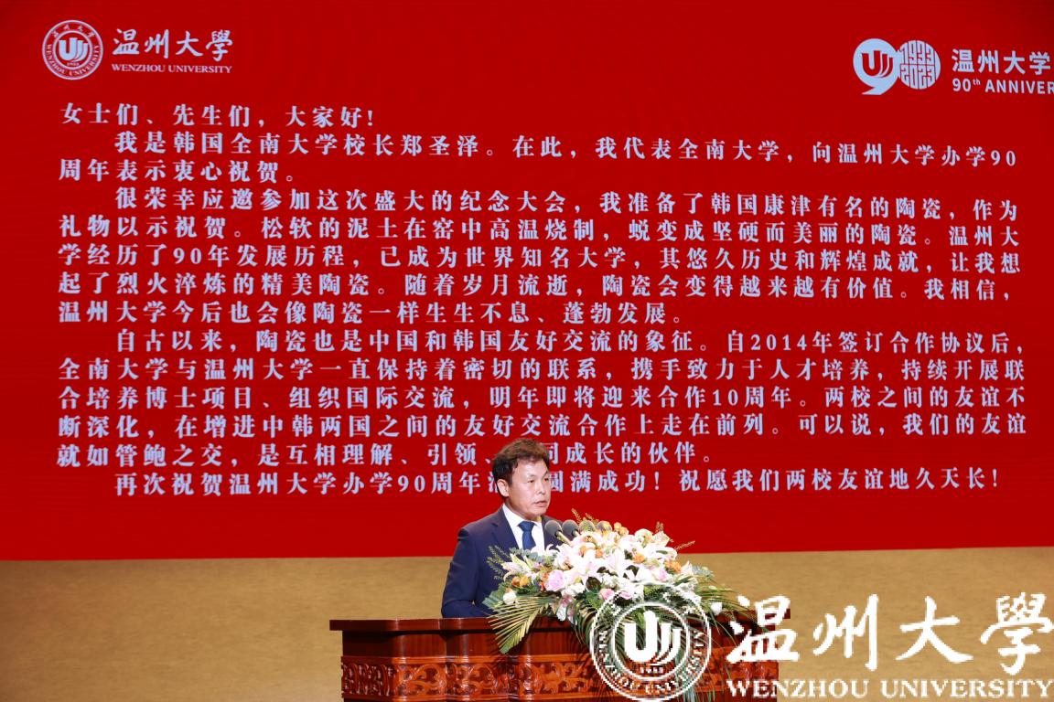 海外合作院校代表、韩国全南大学校长郑圣泽致辞。他代表全南大学向温州大学办学90周年表示衷心祝贺。他表示,温州大学的悠久历史和辉煌成就像一件美丽的陶瓷艺术品,经受岁月的洗礼而愈发生生不息、蓬勃发展。两校是互相理解、引领、共同成长的伙伴。自2014年签订合作协议后全南大学与温州大学一直保持着密切合作,携手致力于人才培养,持续开展联合培养博士项目、组织国际交流,明年即将迎来合作10周年。两校之间的友谊不断深化,在增进中韩两国之间的友好交流合作上走在前列。祝贺温州大学办学90周年活动圆满成功!祝愿两校友谊地久天长!