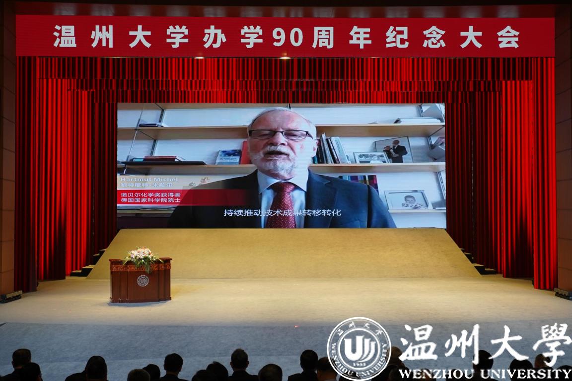 国际科研合作代表,诺贝尔化学奖获得者、德国国家科学院院士、美国科学院、中国科学院、英国皇家学会外籍院士,Hartmut Michel(哈特穆特•米歇尔)视频致辞。他向温州大学办学90周年致以诚挚的祝贺!他表示,近年来温州大学在学科科研、人才培育等方面均取得了卓越成绩,国际排名不断提升,国际影响力不断提升,为教育事业与经济社会发展作出了重要贡献。他期待与温州大学开展更加广泛、紧密、持续的高水平合作,持续推动技术成果转移转化,争取培养更多具有创新能力的国际化高端人才。他祝愿温州大学以办学90周年活动为契机,全面回顾办学历史、系统总结办学经验、科学谋划办学方略,谱写学校发展新篇章。