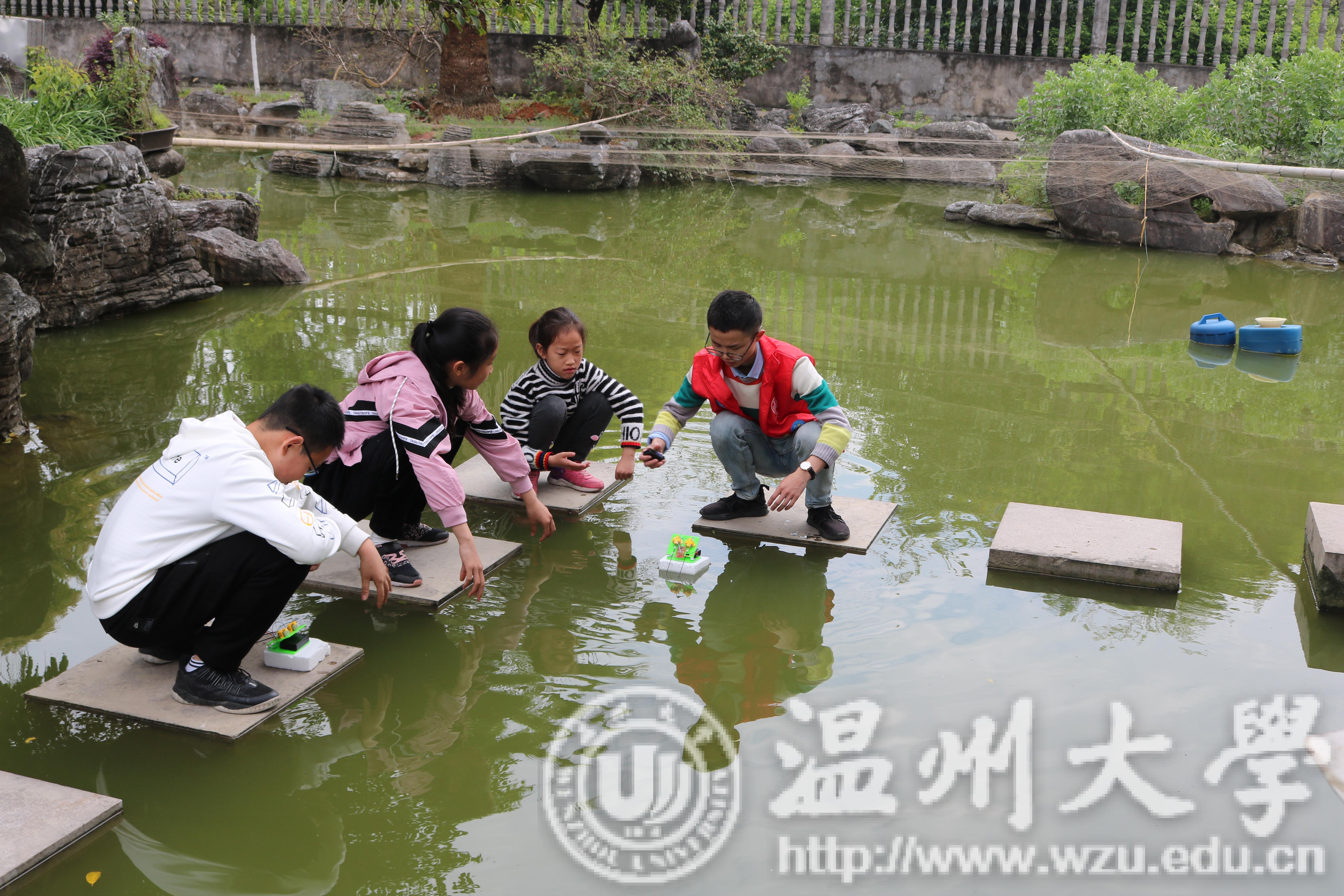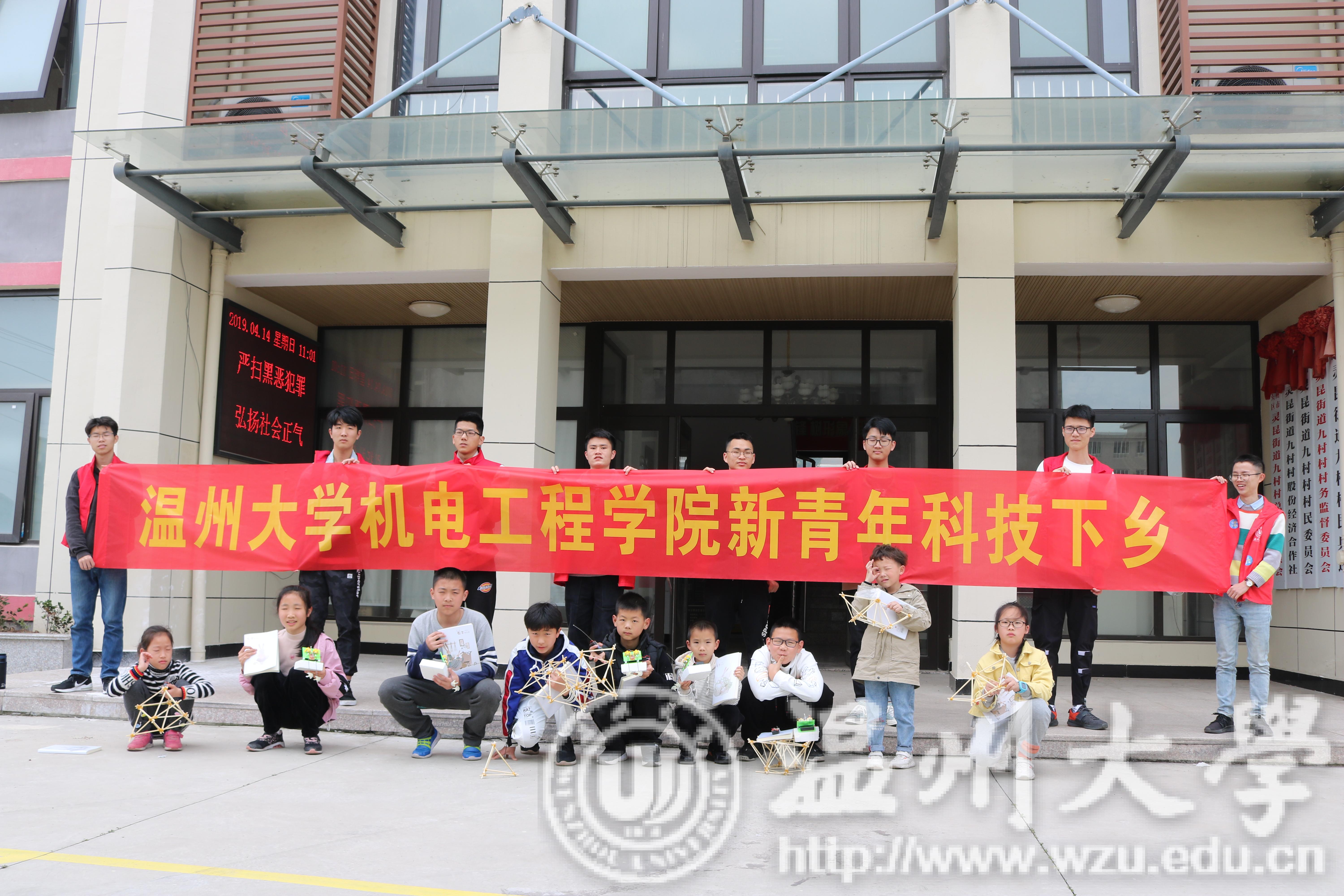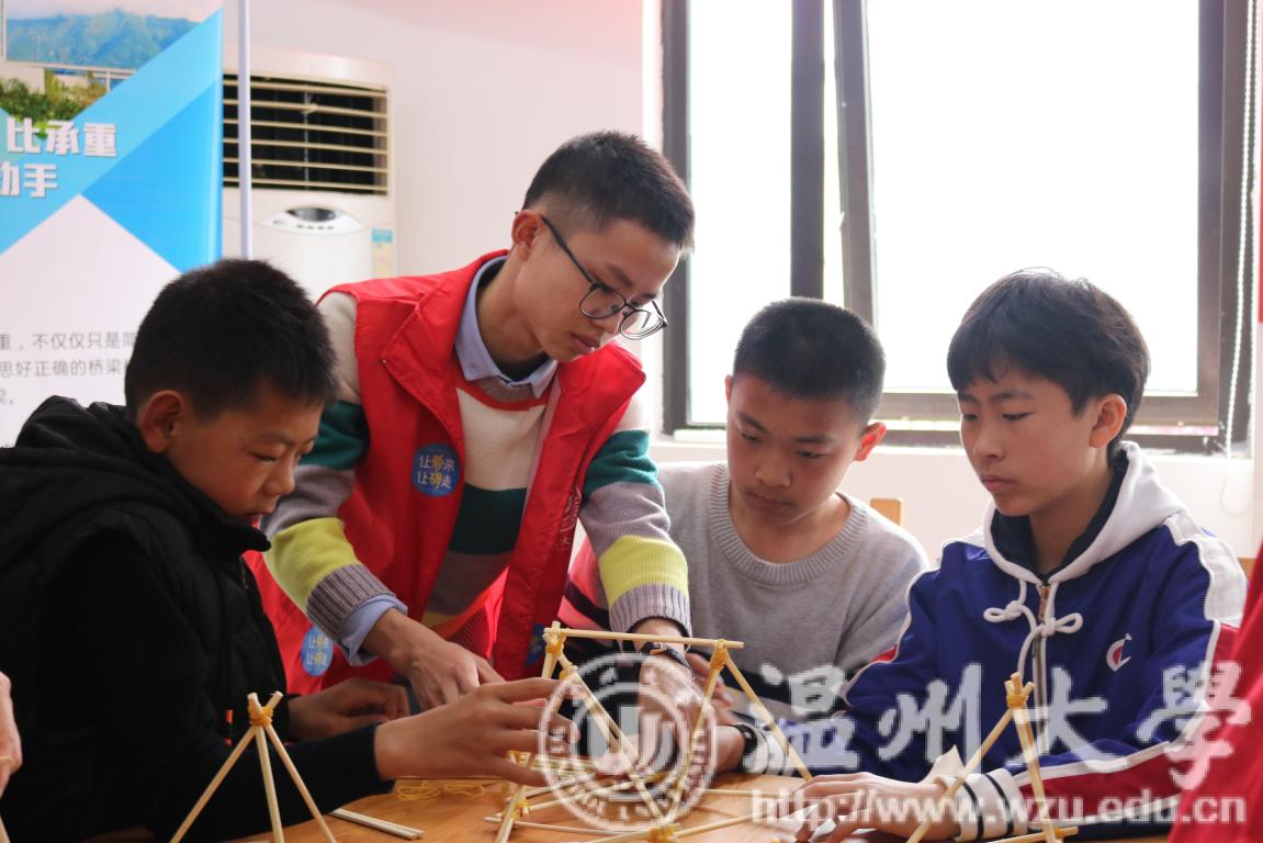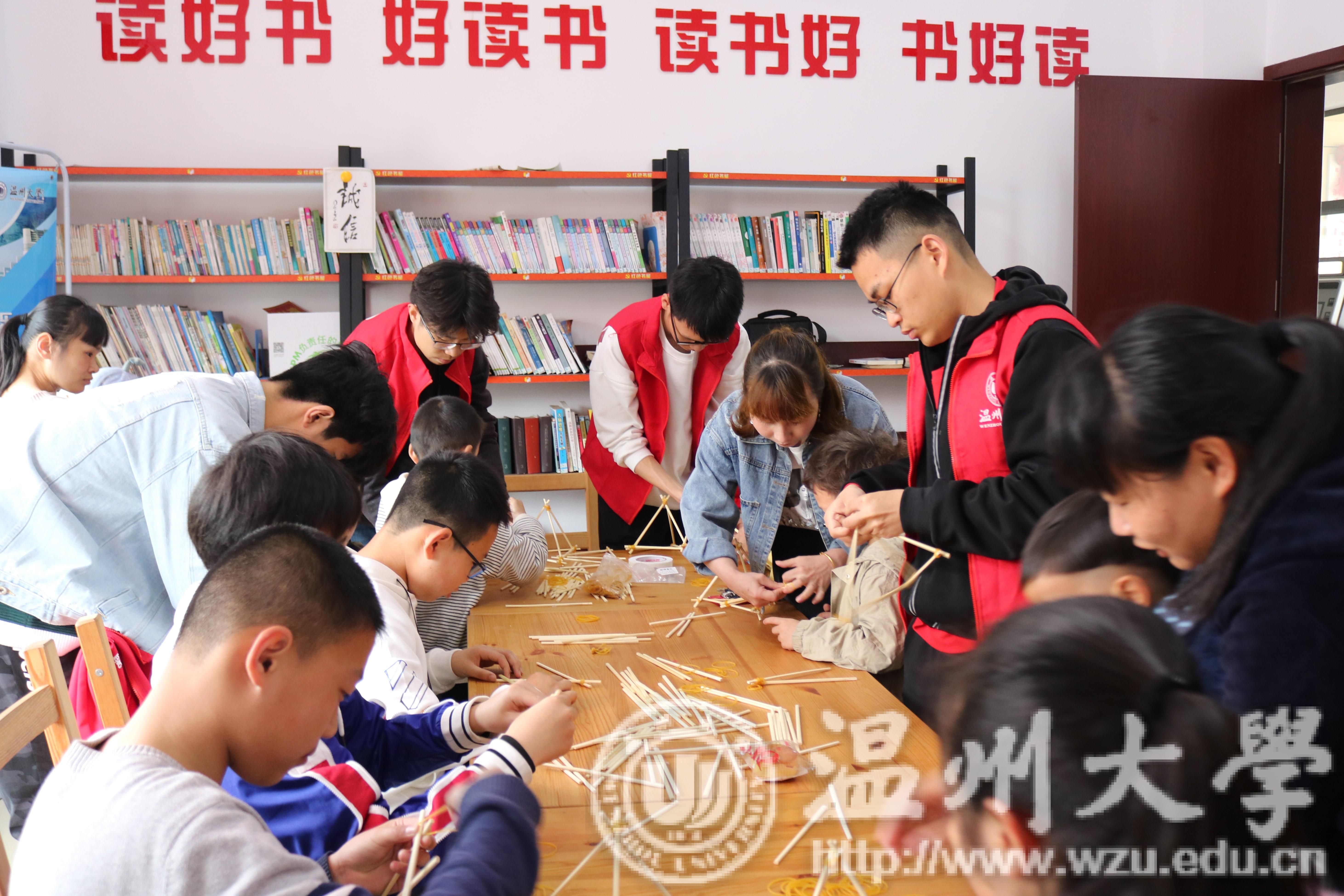 2019年4月14日,开云体育-开云体育app下载 志愿者们于洞头区灵昆街道九村村居民中心举办“大手携小手,共创科技梦” 开云体育-开云体育app下载 志愿者服务之科技下乡活动。开云体育 新青年志愿者们由辅导员胡施施老师带队,为九村村的小朋友们讲解科技小知识并共同完成筷子大桥、电动小船的制作。