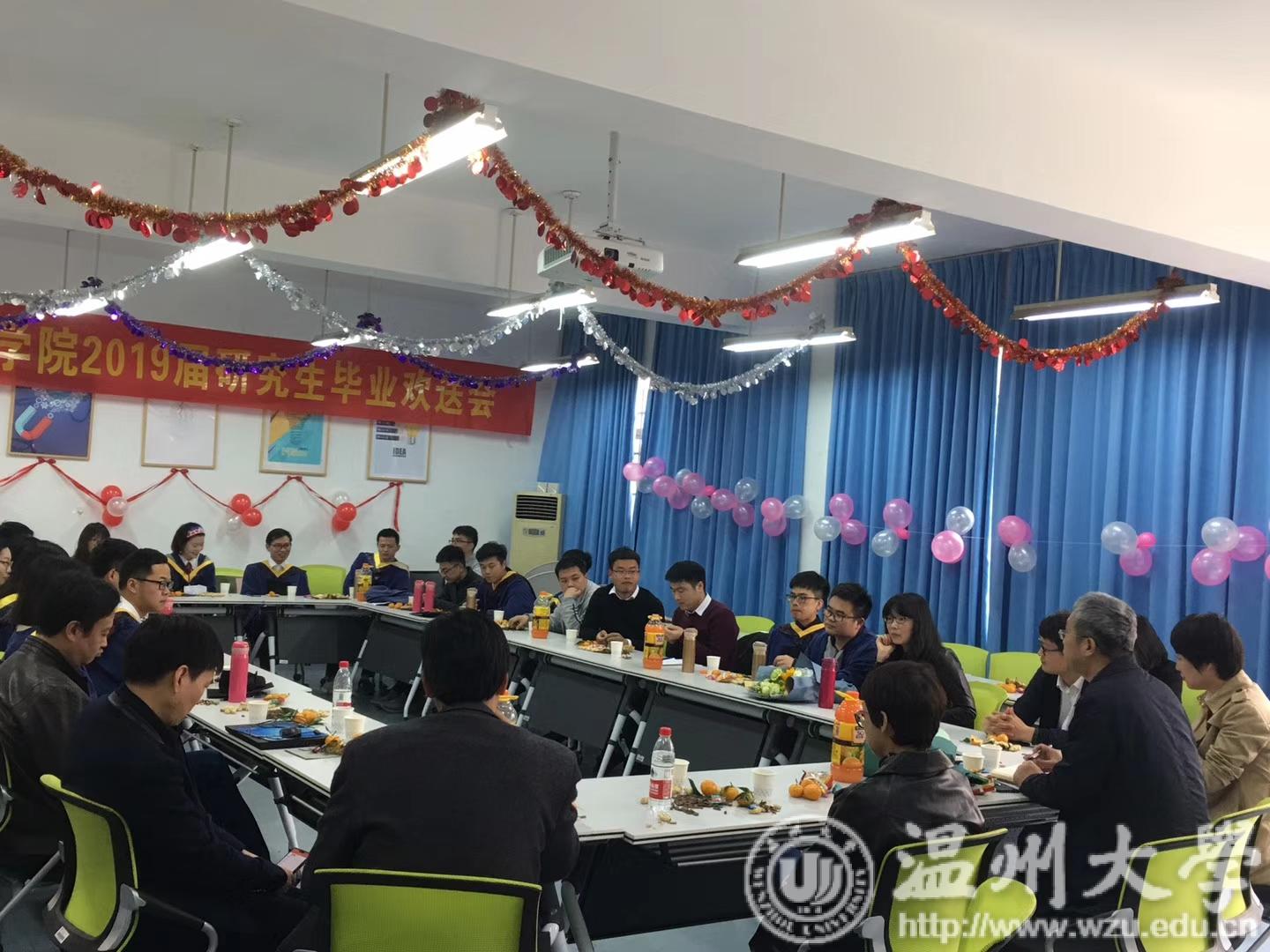 相逢即是一首歌,全体硕士毕业生用一首《明天会更好》开启了本次欢送会的篇章,诉说着这些年的青春,也寄托了对未来的憧憬。三年的成长当然离不开老师的谆谆教诲,毕业生们录制了一段VCR来表达他们对导师们的感谢与不舍。在VCR播放结束后,毕业生代表叶栋上台发言,他用自己铿锵的声音来讲述这值得眷恋、值得珍藏、值得感恩的三年。言毕,毕业生代表们纷纷为导师们进献鲜花,来感谢这些年对他们的栽培之情。临别之际,导师们也有许多话想对毕业生们说,于是他们录制了一段视频来表达自己对毕业生的不舍。随后是导师送礼环节,学院的老师们向毕业生们送出精心准备的保温杯,希望浓浓的师生情如同这保温杯一样,温情永驻。紧接着,周荣书记上台讲话,他祝愿所有的毕业生们都能前程似锦,将来能用傲人的成绩来纪念这非凡的三年。最后周宏明院长上台讲话,对毕业生们表达了他最虔诚的祝福,望所有的毕业生们都能实现自己的人生价值,敢于追梦,奋勇前行。最后,全体硕士研究生毕业生导师代表及毕业生移步到B201会议室参加毕业欢送会。导师和毕业生畅所欲言,回顾三年校园生活中难忘的点点滴滴。导师对毕业生表示祝贺以及浓浓的祝福,毕业生也表达了对导师由衷的感谢,对学院发展的提了一些意见以及祝愿。