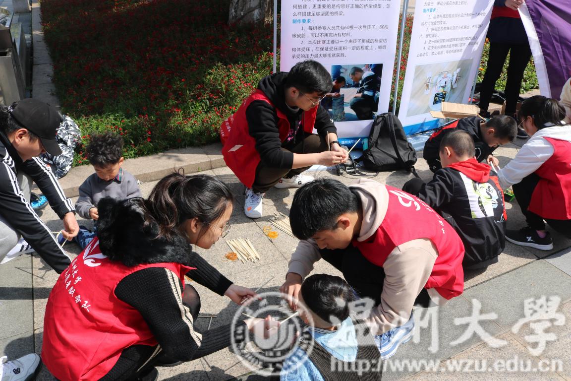 早上的太阳驱散了连日的阴霾与严寒,大家都兴致满满的出发前往科技馆。到达目的地后大家开始了紧迫的准备工作,为了我们的模型船与筷子搭桥的活动,搭标识、准备模型船、搭桥工具等。太阳很大但是依旧比不上我们与小朋友火热的心,他们一个个的被标志吸引,从起初的胆小、小心翼翼,到后来的随心所欲,发挥自己的想象力与创造力。部分小孩子的动手能力甚至让人惊异,从一开始的生疏,到逐渐实现自己太空船的熟练;从起初的人烟罕见,到人满为患材料不足,小朋友们纯真的内心与他们天马行空的想法着实让我们感受到了他们的活力。日渐正午,活动也接近尾声,全体志愿者与小孩子合影留念,本次志愿者活动圆满结束。